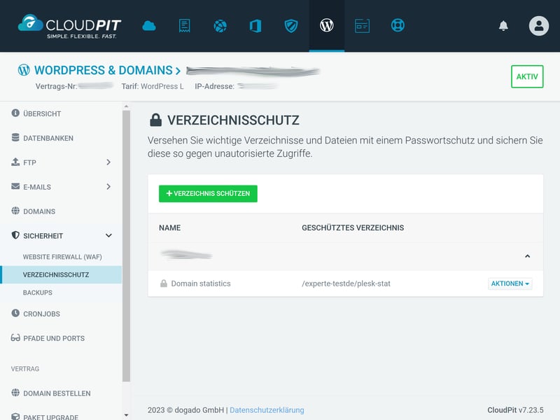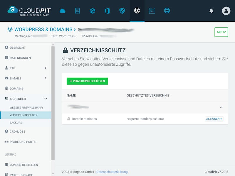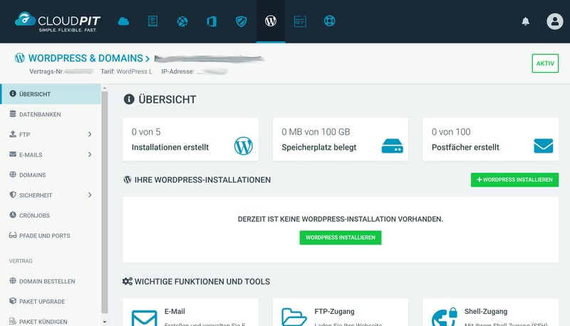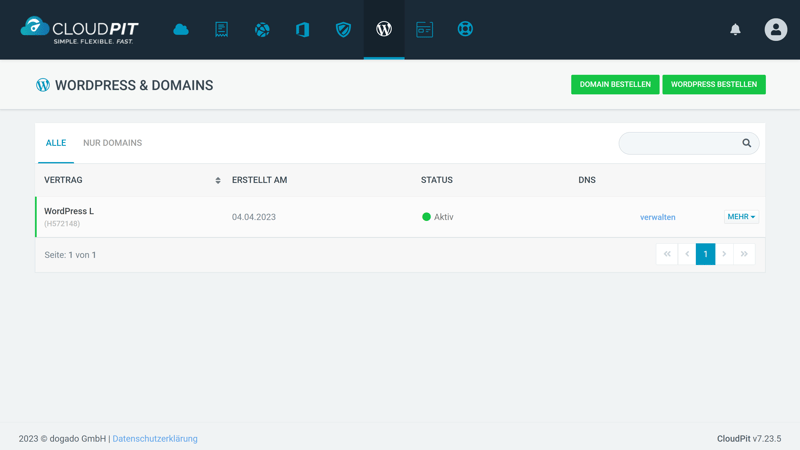 dogados CloudPit ist in verschiedene Unterbereiche eingeteilt, was in Anbetracht der vielen Produkte, die dogado anbietet, sinnvoll ist. Im WordPress-Bereich finden Sie alle wesentlichen Daten Ihrer WordPress-Installationen.