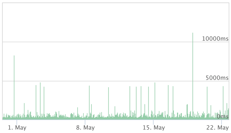Die folgende Grafik zeigt die jeweils schlechteste Antwortzeit pro Stunde im gesamten Testzeitraum. Sie war insgesamt recht gleichmäßig und hatte nur weniger Ausschläge nach oben: