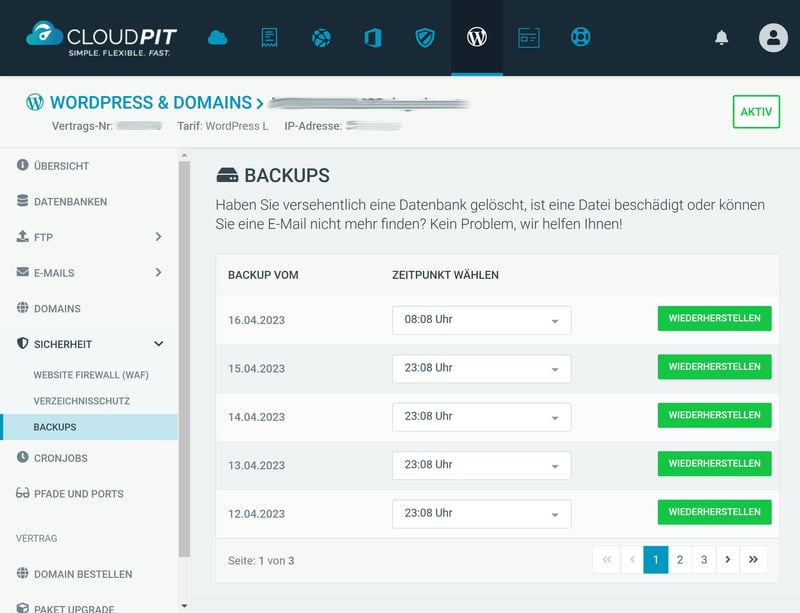 Um ein Backup wiederherzustellen, müssen Sie im CloudPit einfach zu Sicherheit > Backups navigieren, das gewünschte Backup auswählen und auf den grünen „Wiederherstellen“-Button klicken.
