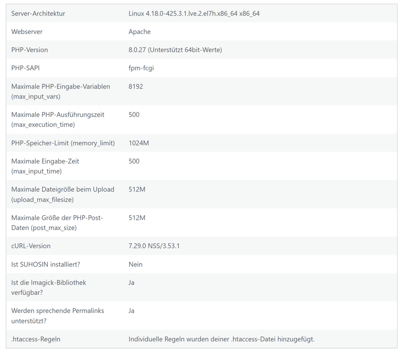 In den PHP-Einstellungen sehen Sie weitere Angaben, beispielsweise das Max Memory Limit. Jenes wird jedoch vom Tarif vorgegeben und lässt sich nicht manuell bearbeiten. Dafür können Sie Einstellungen wie display_errors oder opcache.enable aktivieren und deaktivieren.