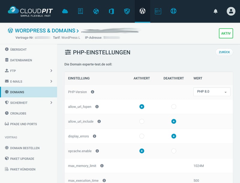 Die PHP-Einstellungen finden Sie im Domain-Bereich im CloudPit.