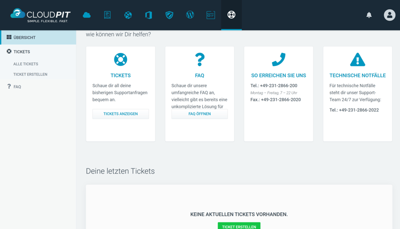 Den Support-Bereich von dogado erreichen Sie über den entsprechenden Menüpunkt in der CloudPit-Navigation. Hier finden Sie eine Hotline, die montags bis freitags von 7 bis 22 Uhr besetzt ist, sowie eine rund um die Uhr verfügbare Notfall-Nummer für technische Notfälle.