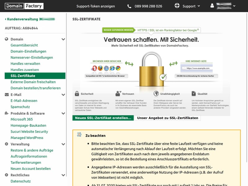 In allen Tarifen ist ein kostenloses SSL-Zertifikat enthalten, das eine verschlüsselte Datenübertragung zwischen Ihrer Website und den Browsern von Besuchern garantiert. Im Kundenmenü können Sie unter Domain > SSL-Zertifikate ein Zertifikat erstellen und Ihrer Domain zuweisen.