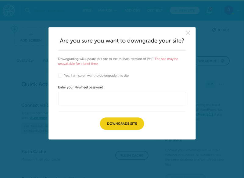 Die neueste PHP-Version 8.2 deckte Flywheel zum Testzeitpunkt leider (genau wie viele Konkurrenten) noch nicht ab, die aktuellste Option war 8.1. Wenn Sie die PHP-Version ändern möchten, ist nur ein Downgrade möglich: Im „Advanced“ Bereich in der WordPress-Verwaltung können Sie lediglich zurück zur Version 7.4 wechseln.