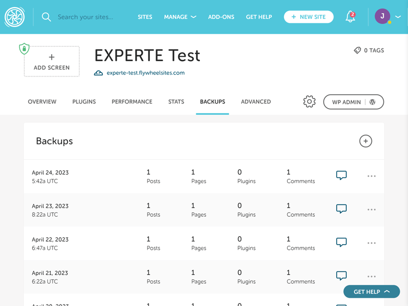 Keine WordPress-Seite sollte ohne Backups auskommen. Glücklicherweise werden jene bei Flywheel automatisch angelegt: Die Plattform erstellt jede Nacht ein Backup Ihrer WordPress-Seite und speichert es 30 Tage lang.