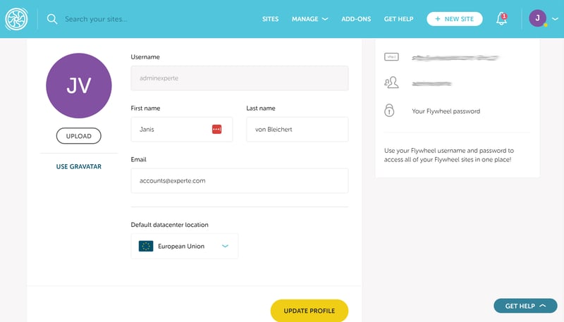 Wenn Sie Ihren Account erstellen, können Sie den Standort Ihres Datencenters festlegen. Sie haben die Wahl zwischen der EU, Australien, Kanada, dem Vereinigten Königreich und den USA. Innerhalb der EU gibt es leider keine weiteren Auswahlmöglichkeiten. Wenn Sie konkret Server in Deutschland benötigen, sollten Sie also einen anderen Hosting-Anbieter wählen (das WordPress-Angebot der Mutterfirma WP Engine beispielsweise).