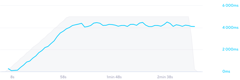 Mit aktiviertem Cache ist die größere Besucherzahl kein Problem – doch die ungecachte Seite hat mächtig zu kämpfen, was sich in längeren Antwortzeiten widerspiegelt. In der Grafik sehen Sie die Entwicklung der Antwortzeit (blaue Linie) bei steigender Besucherzahl (graue Fläche):