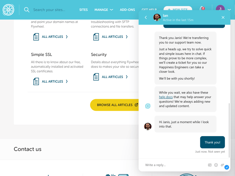 Flywheel nennt seine Support-Mitarbeitenden „Happiness Engineers“. Jene sind 24 Stunden am Tag verfügbar, um die Fragen von Kunden zu beantworten und sich um ihre Probleme zu kümmern.