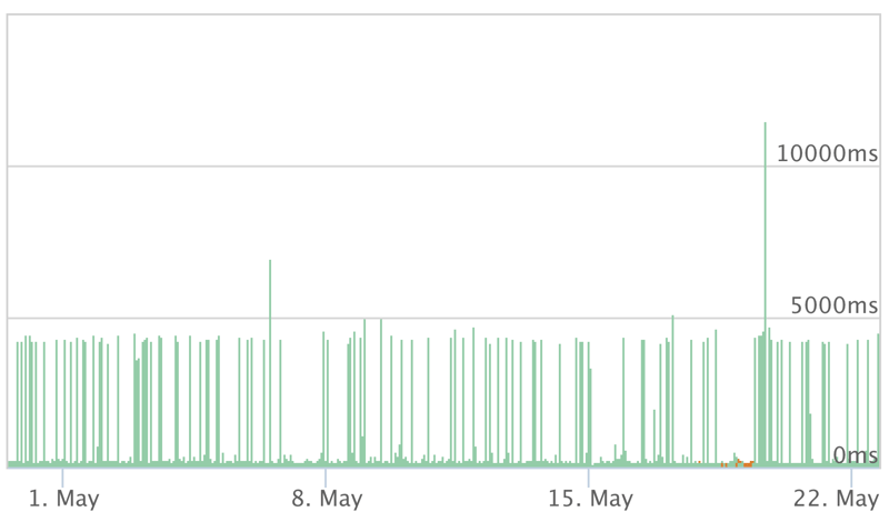 Weil die Antwortgeschwindigkeit mit der Zeit schwanken kann, haben wir sie in unserem 6-Wochen-Testzeitraum regelmäßig mit deaktiviertem Cache getestet. Dadurch erhielten wir nicht nur einen Durchschnittswert, sondern auch einen Eindruck der Schwankungen im Zeitverlauf. Letztere sehen Sie in der folgenden Grafik, die die jeweils schlechteste Antwortzeit pro Stunde im gesamten Testzeitraum zeigt:
