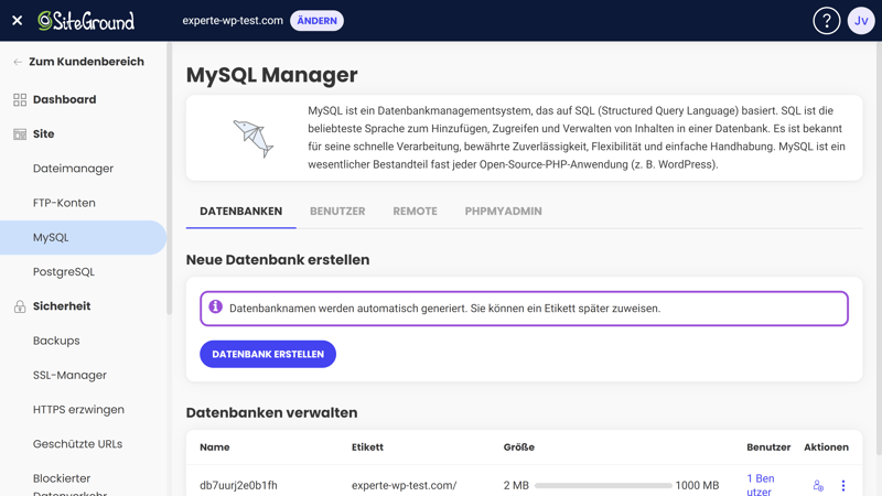 Ihre Datenbanken verwalten Sie in den Site Tools Ihrer WordPress-Website unter Site > MySQL (bzw. PostgreSQL). Hier können Sie mit wenigen Mausklicks neue Datenbanken und Benutzer erstellen und den Remote-Zugriff einrichten. Ein direkter Zugriff auf Ihre Datenbanken ist über die integrierte phpMyAdmin-Konsole möglich.