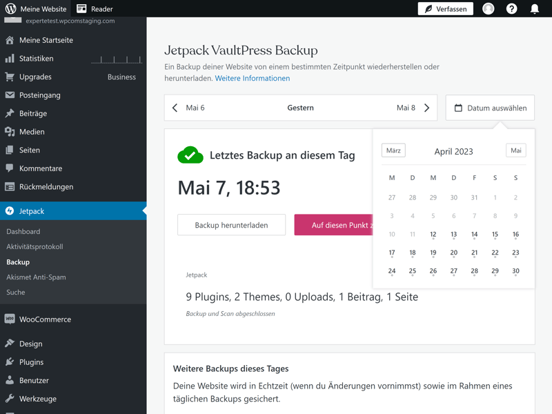 Die Backup-Verwaltung finden Sie unter Jetpack > Backups. Hier können Sie vergangene Sicherungen in einem Kalendermenü einsehen und sie per Mausklick wiederherstellen.