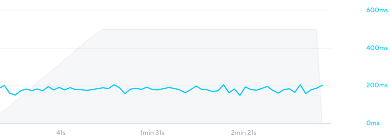 Den Test führten wir einmal mit und einmal ohne aktivierten Cache durch. Keines der beiden Szenarios bereitete WordPress.com Probleme: Selbst ohne Cache hatte die gestiegene Besucherzahl keinerlei Auswirkungen auf die Antwortzeiten. In der folgenden Grafik sehen Sie, wie sich die Antwortzeit (blaue Linie) bei steigender Besucherzahl (graue Fläche) verändert: