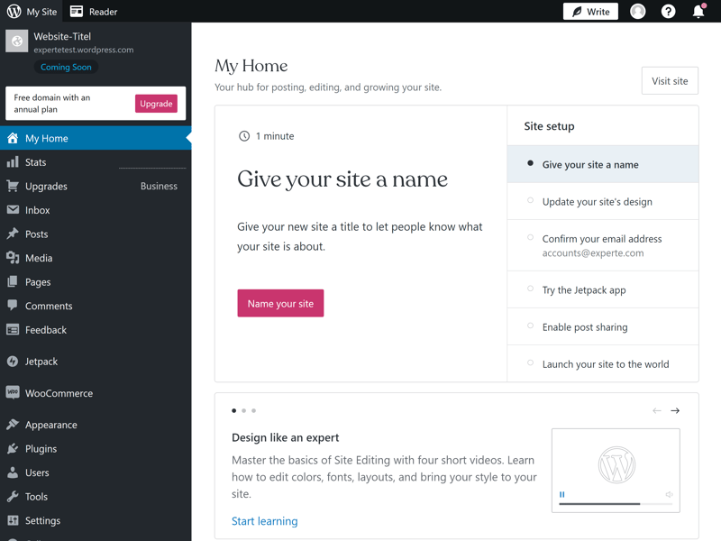 Im Anschluss landen Sie im Control Panel, bei dem es sich schlicht um das Admin Panel von WordPress handelt. Während andere WordPress Hosting-Dienste also ein Extra-Dashboard für die Konfiguration Ihrer Hosting-Lösung besitzen, verwalten Sie bei WordPress.com die Inhalte Ihrer Website und das Hosting in ein und derselben Benutzeroberfläche.