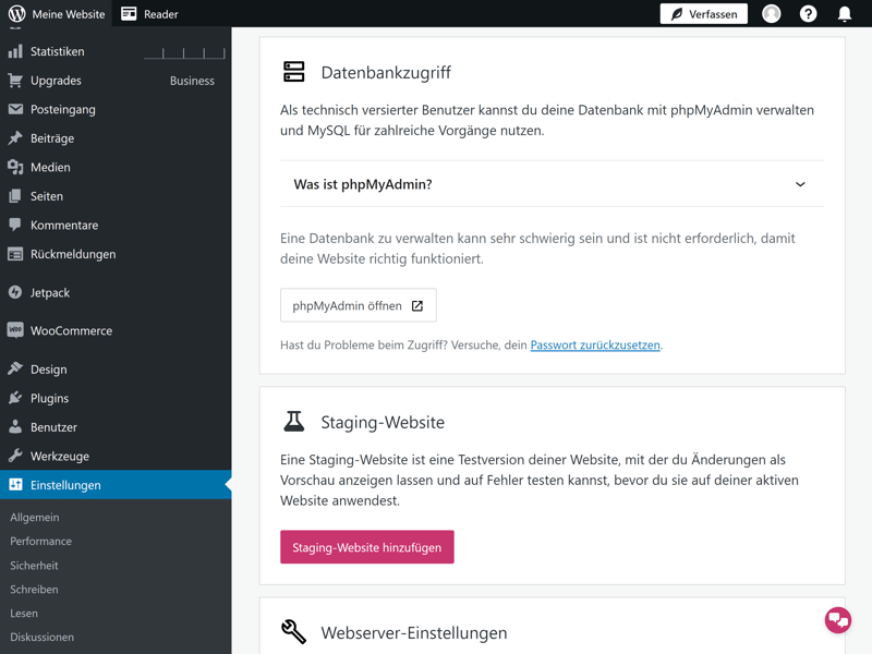 WordPress.com nutzt NGINX-Server und Datenbanken von MariaDB. In der Hosting-Konfiguration in den Einstellungen können Sie Ihre Datenbanken per phpMyAdmin öffnen. Jeder Website lässt sich nur eine einzige Datenbank zuordnen.