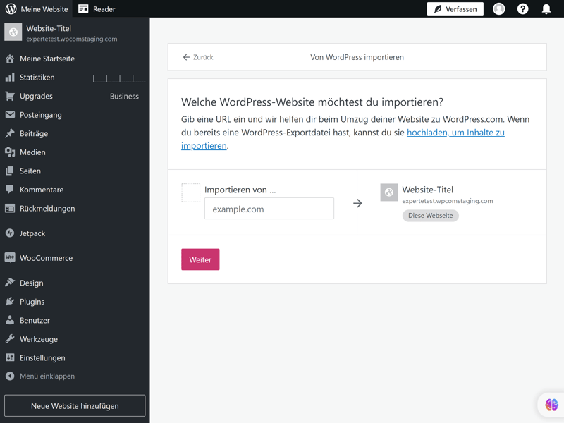 Sie betreiben bereits eine WordPress-Website bei einem anderen Hosting-Dienst und möchten sie nun zu WordPress.com umziehen? Dafür stehen einige Import-Funktionen zur Verfügung: Sie können unter Werkzeuge > Inhalte importieren entweder die gesamten Website-Inhalte, inklusive Plugins und Themes, übertragen, oder nur die Inhalte (Seiten, Beiträge, Kommentare, Kategorien,..) übertragen.