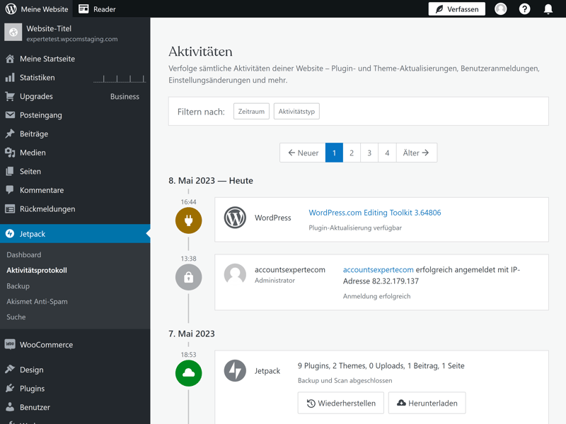 Das bereits erwähnte Jetpack-Plugin hat ein paar weitere Sicherheitsfunktionen parat. Der integrierte Spam-Schutz hält Ihnen beispielsweise lästige Kommentare vom Hals. Für Transparenz sorgt das Aktivitätenprotokoll: Jenes zeichnet alle Website-Ereignisse auf, damit Sie immer genau wissen, welche Änderungen und Eingriffe wann vorgenommen wurden.