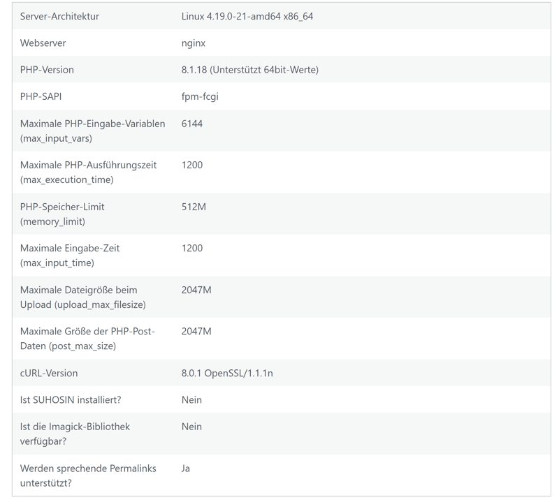 Diese Informationen können Sie dem Server-Bericht entnehmen, den Sie im Admin Panel unter Werkzeuge > Website-Zustand finden: