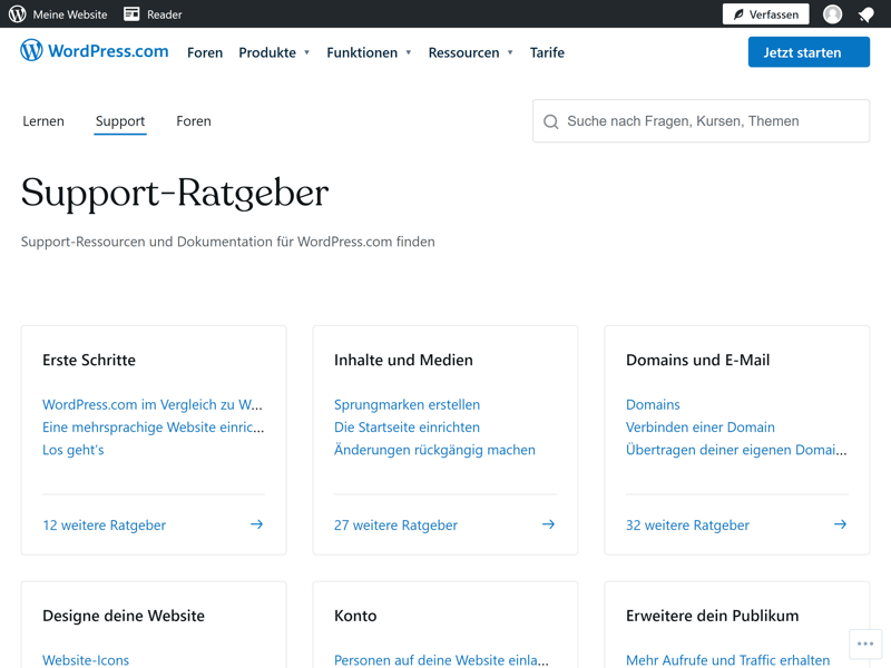 Wenn Sie eine Frage oder ein Problem haben, sollten Sie zuallererst dem Hilfecenter von WordPress.com einen Besuch abstatten. Hier finden Sie einen ausführlichen Ratgeber mit unzähligen Hilfeartikeln in mehreren Sprachen, die allesamt mit Screenshots, Hyperlinks und einem Inhaltsverzeichnis ausgestattet sind.