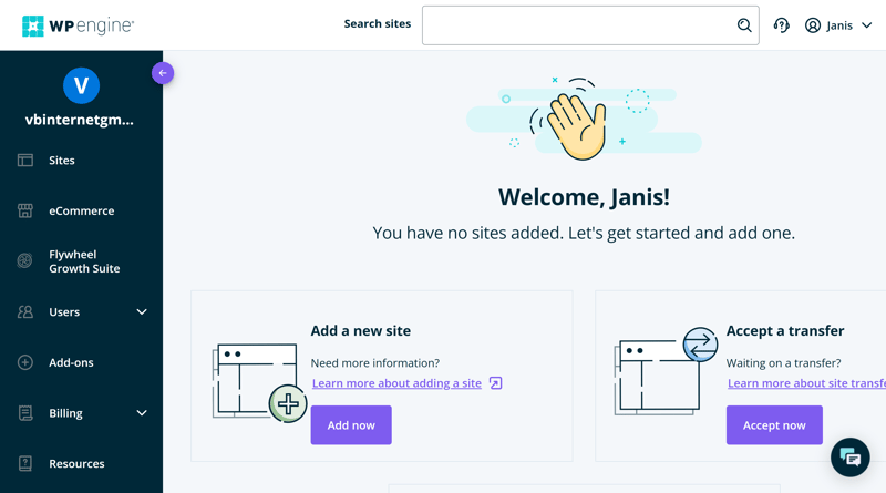 Nach der Installation finden Sie Ihre neue WordPress-Seite unter „My Sites“ im WP Engine-Kundenportal gelistet. Hier findet man sich schnell zurecht: Im Hauptmenü links navigieren Sie zu den übergeordneten Bereichen wie Ihren Websites, E-Commerce-Projekten, der Benutzerverwaltung, Add-ons und Rechnungen.