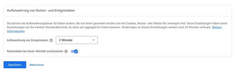 Beschränken Sie die Aufbewahrungsdauer der erhobenen Daten. Voreingestellt werden diese zwei Monate lang aufbewahrt. In Ihrem GA-Konto rufen Sie zur Änderung der Aufbewahrungsdauer die Kontoeinstellungen auf und anschließend das Untermenü Dateneinstellungen. In diesem passen Sie im Feld Aufbewahrung von Ereignisdaten das Löschintervall an. Denken Sie bitte daran, in Ihrer Datenschutzerklärung die Aufbewahrungsdauer ebenfalls entsprechend anzupassen.