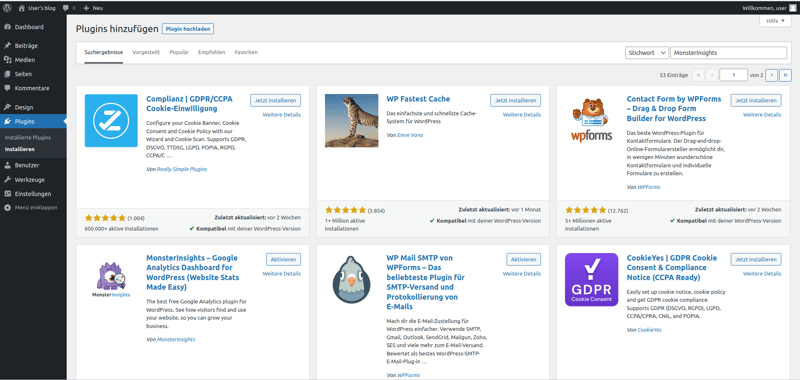 Anschließend klicken Sie oben mittig im Fenster auf den Button „Installieren“. In der nun eingeblendeten Kachelansicht können Sie durch Eingabe des Begriffs „MonsterInsights“ rechts oben im Suchfeld das Plugin suchen lassen. Haben Sie die entsprechende Kachel gefunden, klicken Sie in dieser rechts auf den „Jetzt installieren“-Button. Das Plugin wird daraufhin installiert.