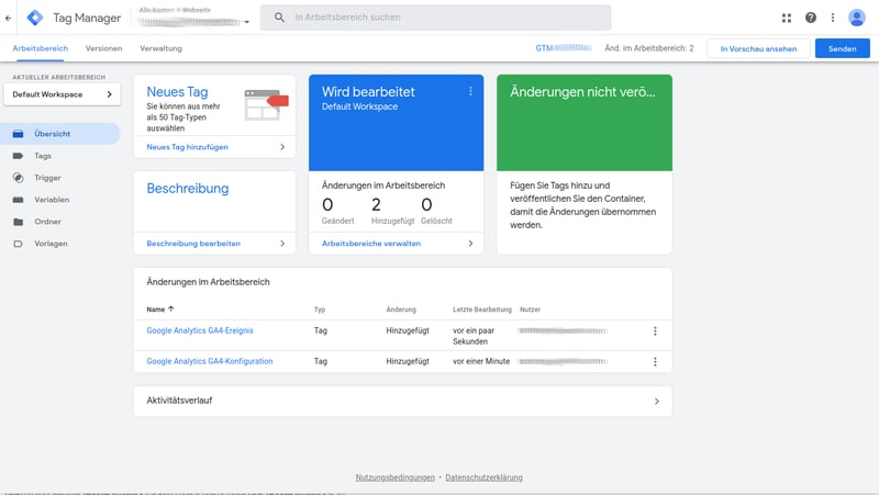 Im Dashboard des Tag-Managers erhalten Sie detaillierte Angaben zu den einzelnen Google-Tags.