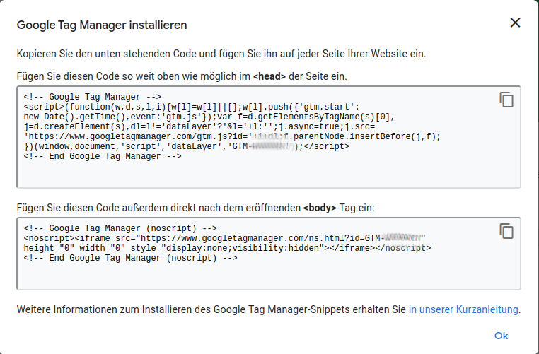 Den Container müssen Sie nun installieren, damit Tags auf Webseiten erfasst werden können. Dazu klicken Sie oben rechts im Dashboard auf die Container-ID (Zeichenfolge, die mit GTM-xxxxx beginnt). Die Software generiert nun zwei Codeschnipsel, die Sie in den Quelltext Ihrer Webseite einbinden. Der erste Codeschnipsel muss dabei direkt hinter dem <head>-Element platziert werden, während der zweite Codeschnipsel nach dem eröffnenden <body>-Element einzufügen ist.