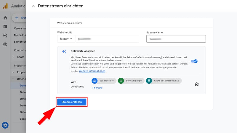 Schritt 2: Tragen Sie im Einrichtungsdialog die nötigen Angaben zur vorhandenen Webseite, dem Google Analytics-Kontonamen und zur Datenfreigabe ein. Danach legen Sie fest, welche Datenstreams analysiert werden sollen. Dabei stehen die Optionen Web, Android-App und iOS-App zur Verfügung.