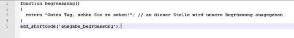 In PHP wird eine Funktion immer mit dem Schlüsselwort function und dem entsprechenden Namen eingeleitet. Danach folgen in geschweiften Klammern die Befehle, die abgearbeitet werden sollen. In unserem Beispiel möchten wir, dass Wordpress Sie beim Aufruf einer Seite freundlich mit „Guten Tag, schön Sie zu sehen!“ begrüßt.