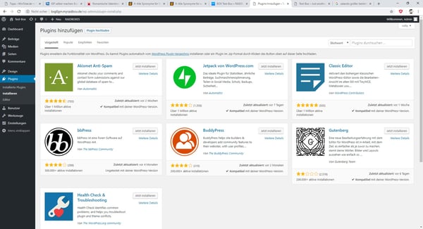 Um Ihr Plugin auf Wordpress zu installieren, loggen Sie sich als Administrator ein und gehen auf das Dashboard. Unter dem Menüpunkt „Plugins“ finden Sie den Unterpunkt „Installieren“.
