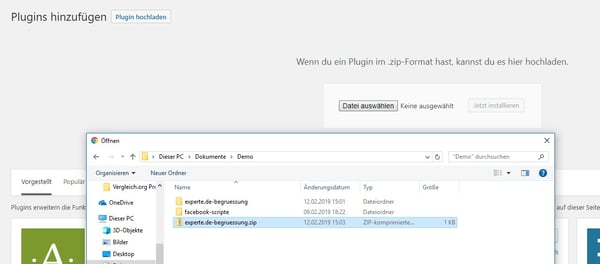 Klicken Sie auf „Plugin hochladen“ und anschließend auf den Button „Datei auswählen“. Navigieren Sie zu Ihrer eben erstellen Zip-Datei und laden Sie diese hoch.