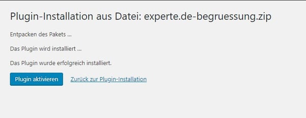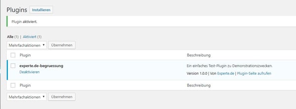 Drücken Sie den Button „Jetzt installieren“, danach werden Sie automatisch auf die Plugin-Übersicht weitergeleitet. Hier finden Sie nun auch Ihr neu erstelltes Plugin. Nach erfolgreicher Installation aktivieren Sie im letzten Schritt das Plugin über „Plugin aktivieren“.