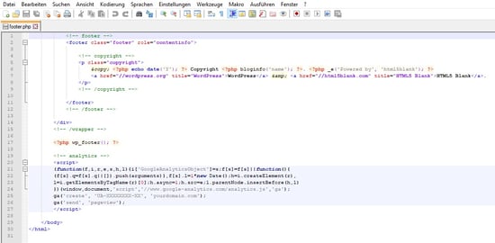 So wiederum würde die ausgelagerte footer.php-Datei aussehen, auf welche am Ende von index.php Bezug genommen wird: