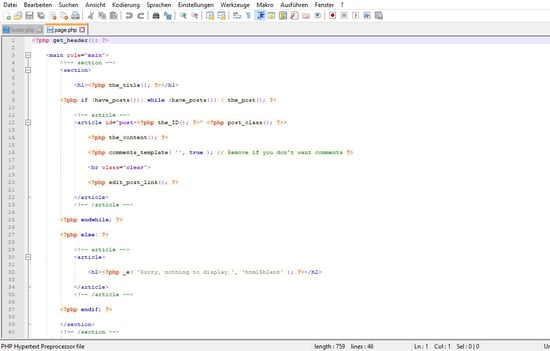 Der Loop wird gerne als das Herzstück einer Wordpress Template-Datei umschrieben, denn er ermöglicht es, dass die Beiträge einer Webseite überhaupt erst ausgegeben werden. Deshalb muss der Loop in jedes Template eingebunden werden, das für die Ausgabe von Inhalten (index.php, page.php, single.php…) verantwortlich ist. Mit dem Loop können Sie beispielsweie bestimmen, wie viele Beitragsvorschauen auf einer Seite angezeigt werden, wie lange der Vorschautext ist und ob unterhalb eines einzelnen Beitrags auf verwandte Beiträge verwiesen wird. Im untenstehenden Beispiel sehen Sie einen Loop, der in die page.php-Datei eingefügt wurde.