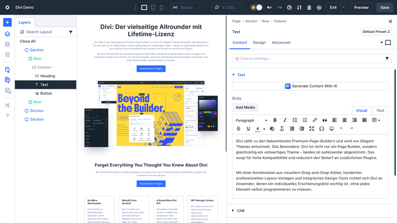 Divi im Live-Editor mit Ebenenstruktur und Modul-Einstellungen