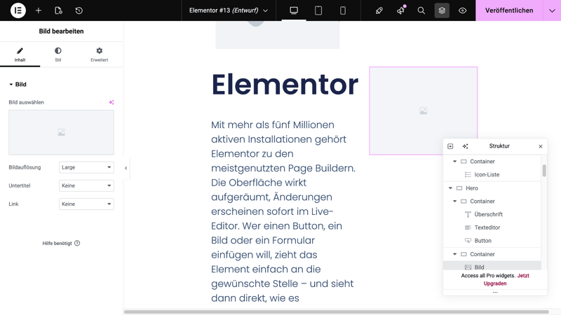 Elementor bietet Standard-Elemente wie Überschriften, Textblöcke, Bilder, Videos, Buttons und Formulare.Layout-Steuerung